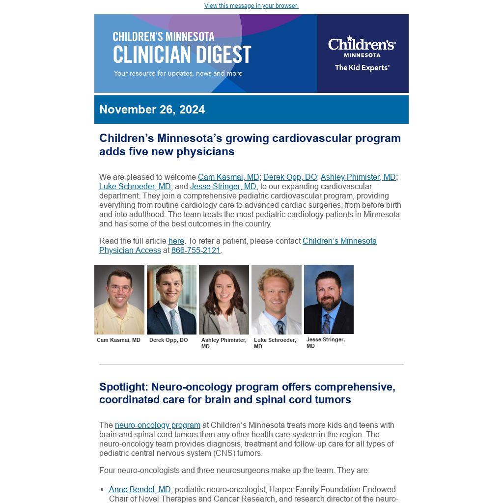 If you find this newsletter valuable, we invite you to send this email to your colleagues so that they can learn about what's happening at Children's Minnesota. If this email was forwarded to you, we encourage you to sign up for the Children's Minnesota Clinician Digest.