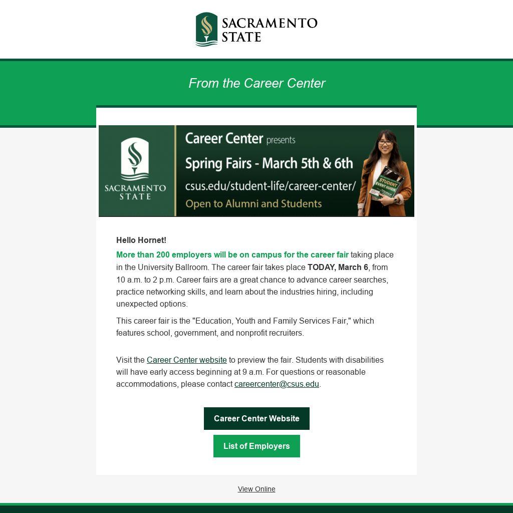 More than 200 employers will be on campus for the career fair taking place in the University Ballroom. The career fair takes place TODAY, March 6, from 10 a.m. to 2 p.m. Career fairs are a great chance to advance career searches, practice networking skills, and learn about the industries hiring, including unexpected options.