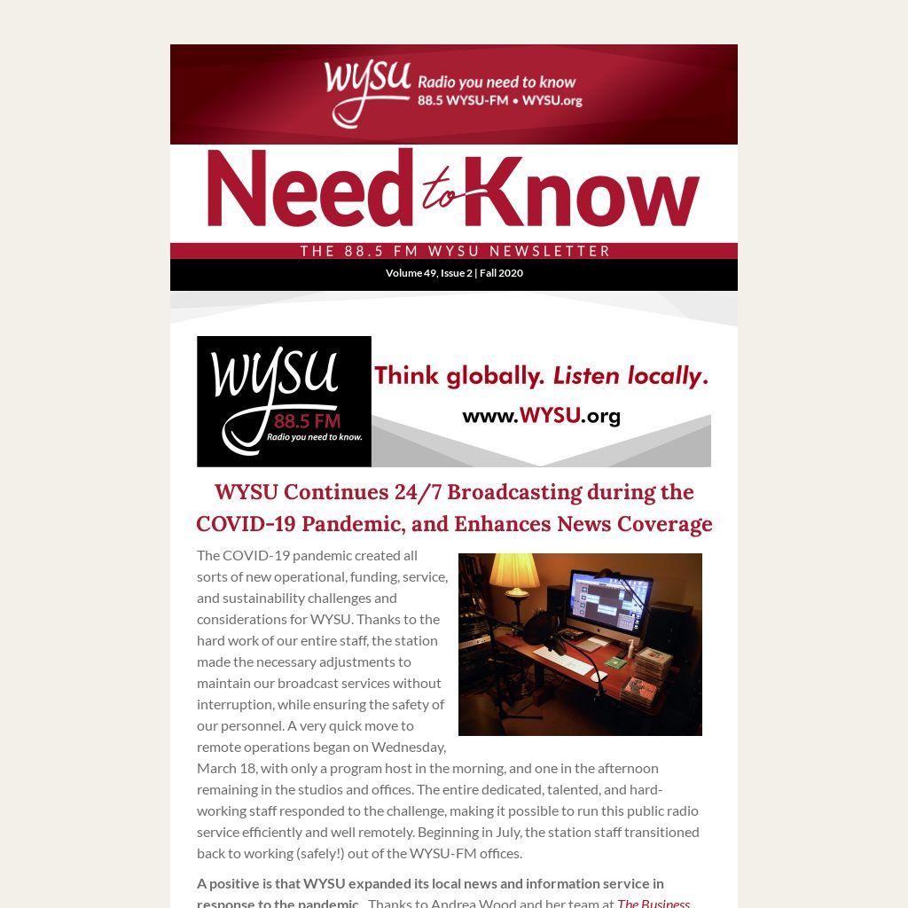 Mahoning Matters News Report, was added to the top of each hour, and has been a valuable addition to the news service. WYSU has also been providing a great deal of informational spots directed to YSU students and their families, and to local nonprofits and community members in need of assistance because of the pandemic.