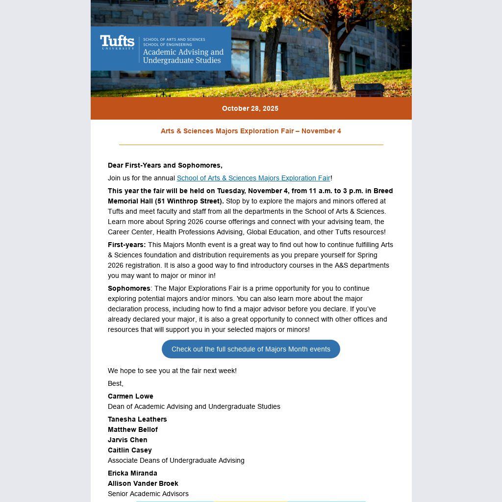 This year the fair will be held on Tuesday, November 4, from 11 a.m. to 3 p.m. in Breed Memorial Hall (51 Winthrop Street). Stop by to explore the majors and minors offered at Tufts and meet faculty and staff from all the departments in the School of Arts & Sciences. Learn more about Spring 2026 course offerings and connect with your advising team, the Career Center, Health Professions Advising, Global Education, and other Tufts resources!