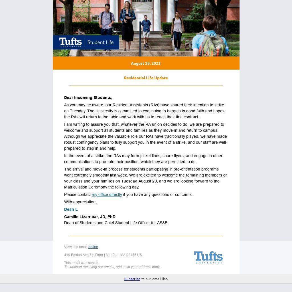 As you may be aware, our Resident Assistants (RAs) have shared their intention to strike on Tuesday. The University is committed to continuing to bargain in good faith and hopes the RAs will return to the table and work with us to reach their first contract.