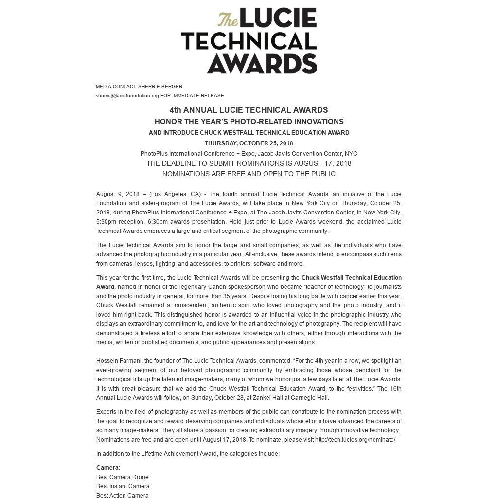 August 9, 2018 – (Los Angeles, CA) - The fourth annual Lucie Technical Awards, an initiative of the Lucie Foundation and sister-program of The Lucie Awards, will take place in New York City on Thursday, October 25, 2018, during PhotoPlus International Conference + Expo, at The Jacob Javits Convention Center, in New York City, 5:30pm reception, 6:30pm awards presentation. Held just prior to Lucie Awards weekend, the acclaimed Lucie Technical Awards embraces a large and critical segment of the photographic community.