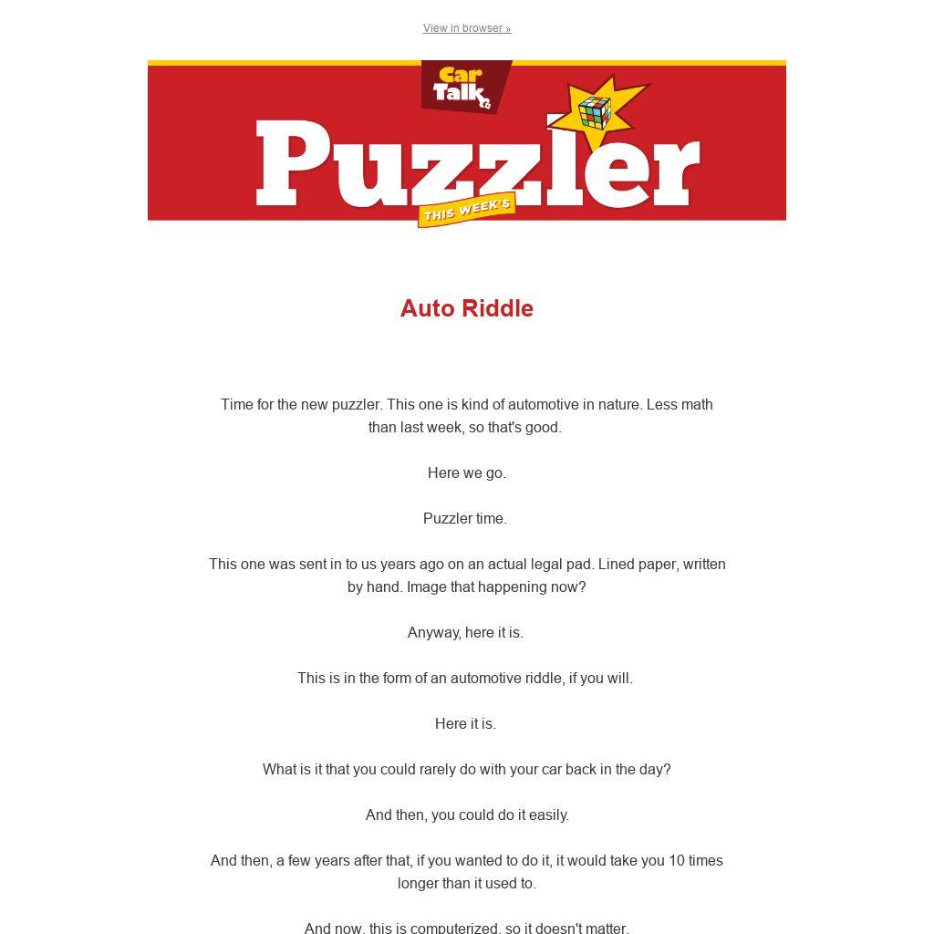 Time for the new puzzler. This one is kind of automotive in nature. Less math than last week, so that's good.