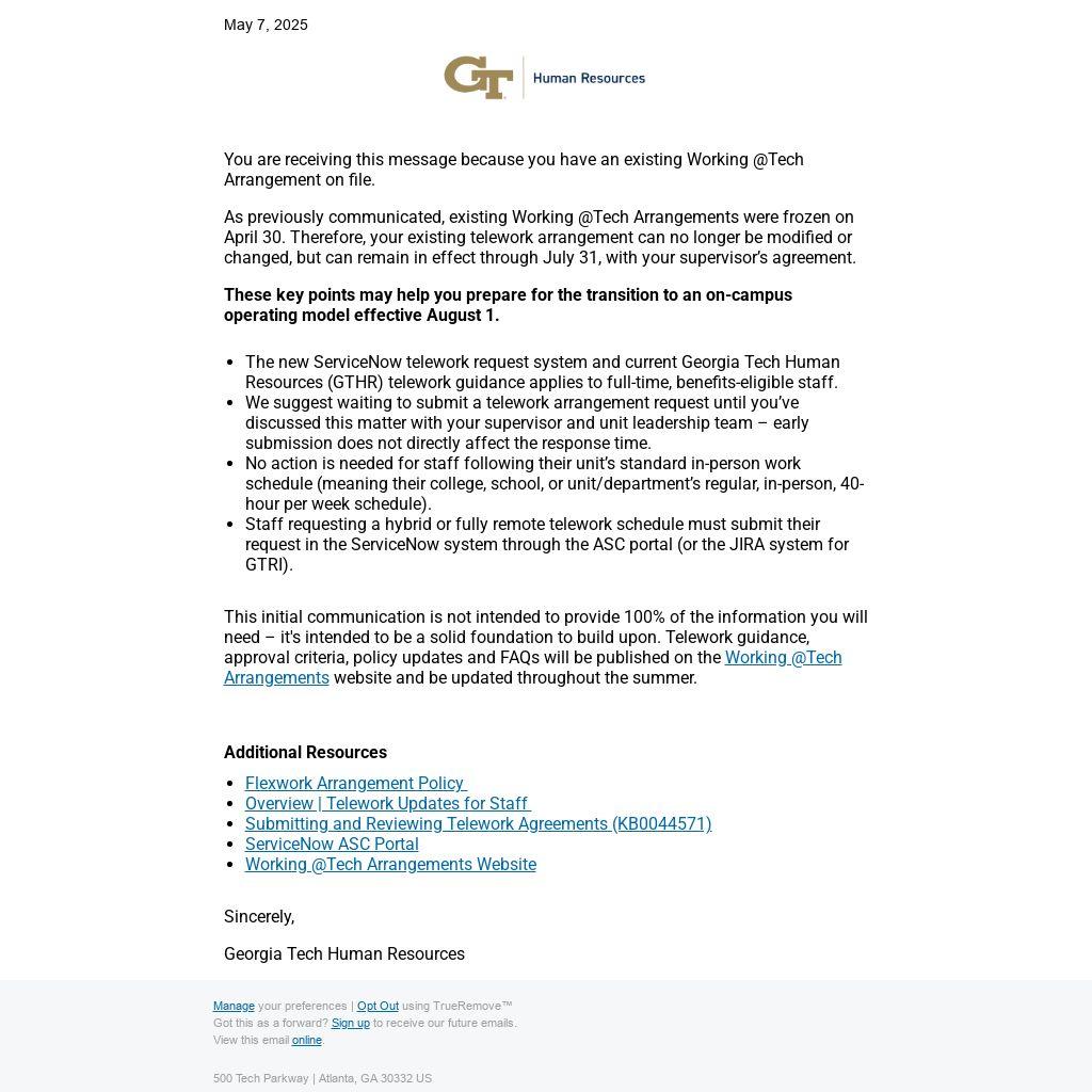 As previously communicated, existing Working @Tech Arrangements were frozen on April 30. Therefore, your existing telework arrangement can no longer be modified or changed, but can remain in effect through July 31, with your supervisor’s agreement.