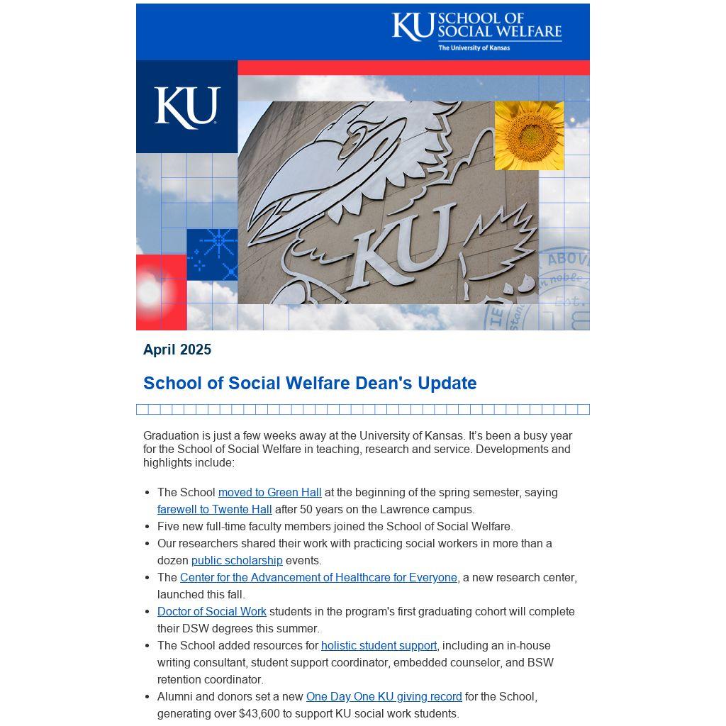 Graduation is just a few weeks away at the University of Kansas. It’s been a busy year for the School of Social Welfare in teaching, research and service. Developments and highlights include: