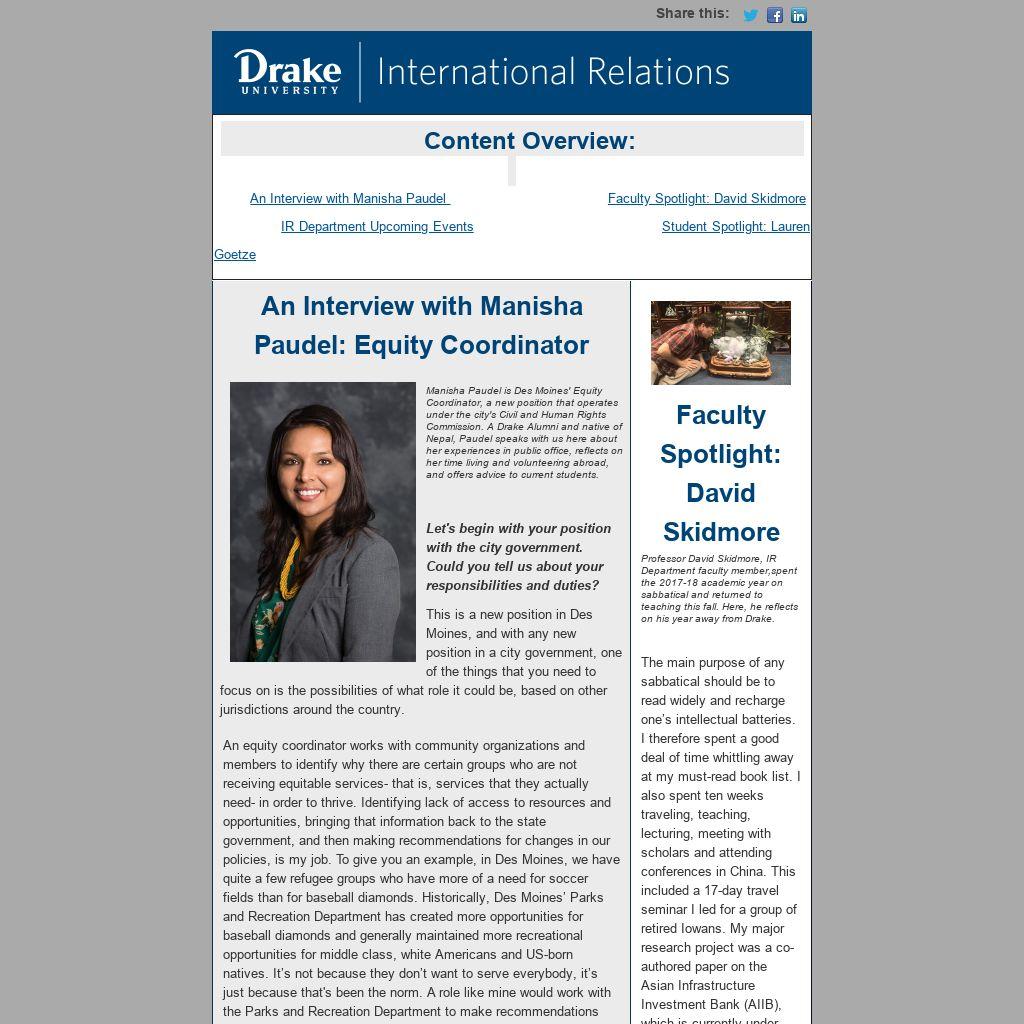 Manisha Paudel is Des Moines' Equity Coordinator, a new position that operates under the city's Civil and Human Rights Commission. A Drake Alumni and native of Nepal, Paudel speaks with us here about her experiences in public office, reflects on her time living and volunteering abroad, and offers advice to current students.