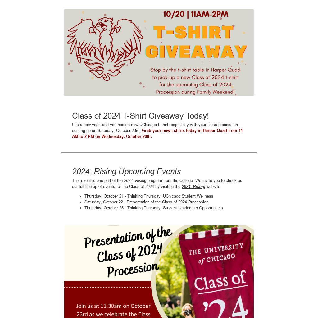 It is a new year, and you need a new UChicago t-shirt, especially with your class procession coming up on Saturday, October 23rd. Grab your new t-shirts today in Harper Quad from 11 AM to 2 PM on Wednesday, October 20th.