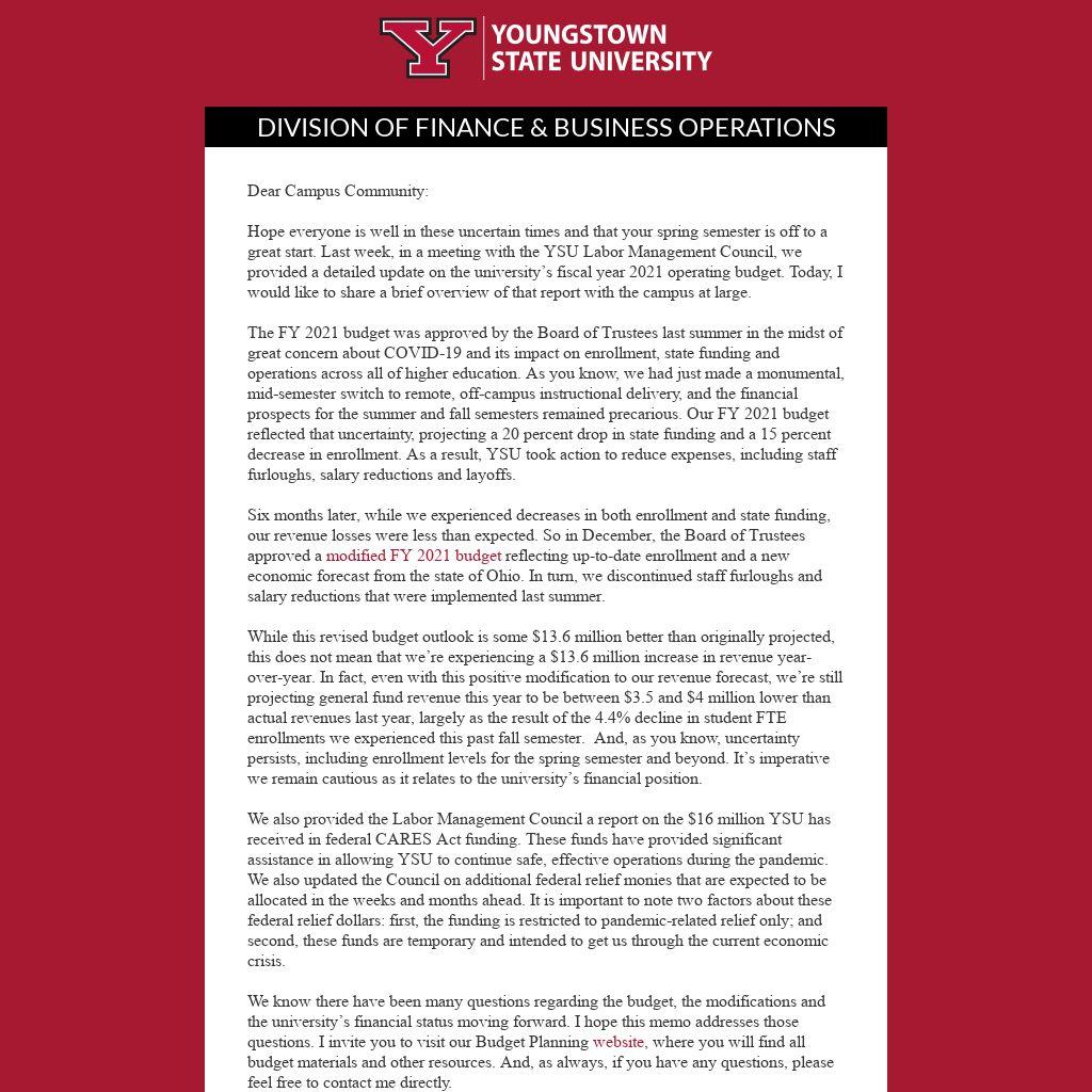 We also provided the Labor Management Council a report on the $16 million YSU has received in federal CARES Act funding. These funds have provided significant assistance in allowing YSU to continue safe, effective operations during the pandemic. We also updated the Council on additional federal relief monies that are expected to be allocated in the weeks and months ahead. It is important to note two factors about these federal relief dollars: first, the funding is restricted to pandemic-related relief only; and second, these funds are temporary and intended to get us through the current economic crisis. We know there have been many questions regarding the budget, the modifications and the university’s financial status moving forward. I hope this memo addresses those questions. I invite you to visit our Budget Planning website, where you will find all budget materials and other resources. And, as always, if you have any questions, please feel free to contact me directly. Thank you and go Penguins! Neal McNally Vice President for Finance & Business Operations