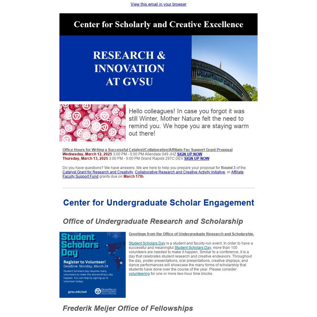 Office Hours for Writing a Successful Catalyst/Collaborative/Affiliate Fac Support Grant Proposal Wednesday, March 12, 2025 3:00 PM - 5:00 PM Allendale 049 JHZ SIGN UP NOW Thursday, March 13, 2025 3:00 PM - 5:00 PM Grand Rapids 297C DEV SIGN UP NOW