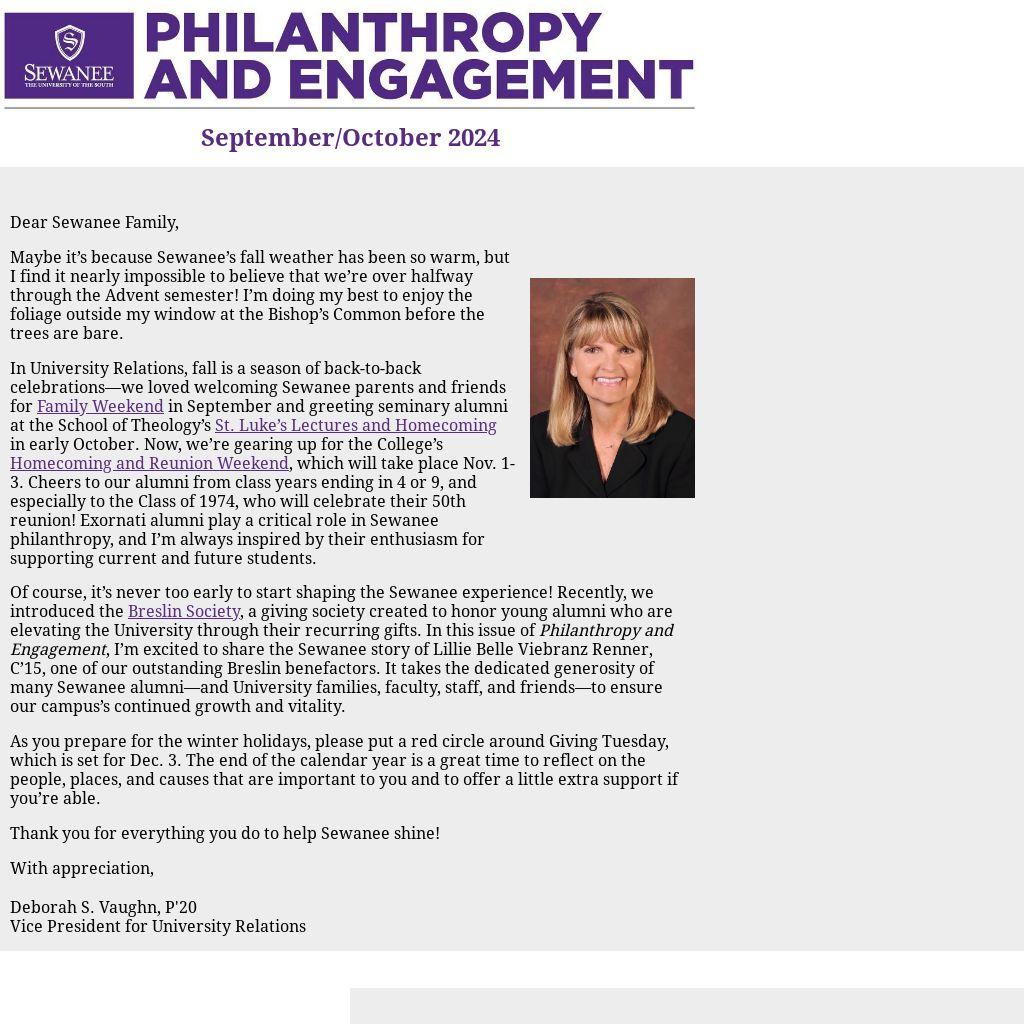 Of course, it’s never too early to start shaping the Sewanee experience! Recently, we introduced the Breslin Society, a giving society created to honor young alumni who are elevating the University through their recurring gifts. In this issue of Philanthropy and Engagement, I’m excited to share the Sewanee story of Lillie Belle Viebranz Renner, C’15, one of our outstanding Breslin benefactors. It takes the dedicated generosity of many Sewanee alumni—and University families, faculty, staff, and friends—to ensure our campus’s continued growth and vitality.