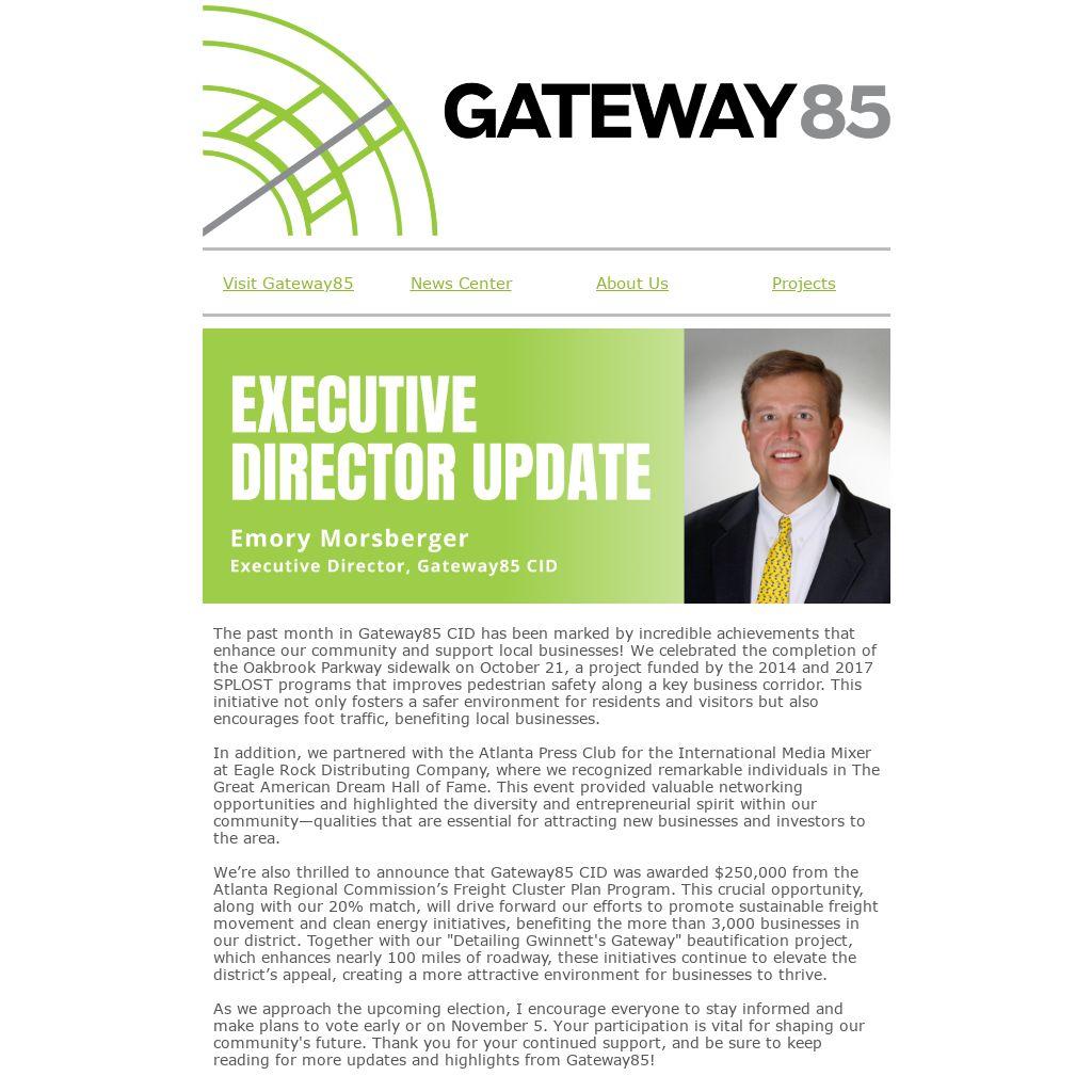 As we approach the upcoming election, I encourage everyone to stay informed and make plans to vote early or on November 5. Your participation is vital for shaping our community's future. Thank you for your continued support, and be sure to keep reading for more updates and highlights from Gateway85!