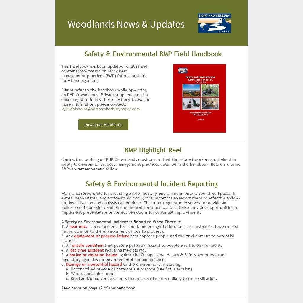 Please refer to the handbook while operating on PHP Crown lands. Private suppliers are also encouraged to follow these best practices. For more information, please contact: kyle.chisholm@porthawkesburypaper.com