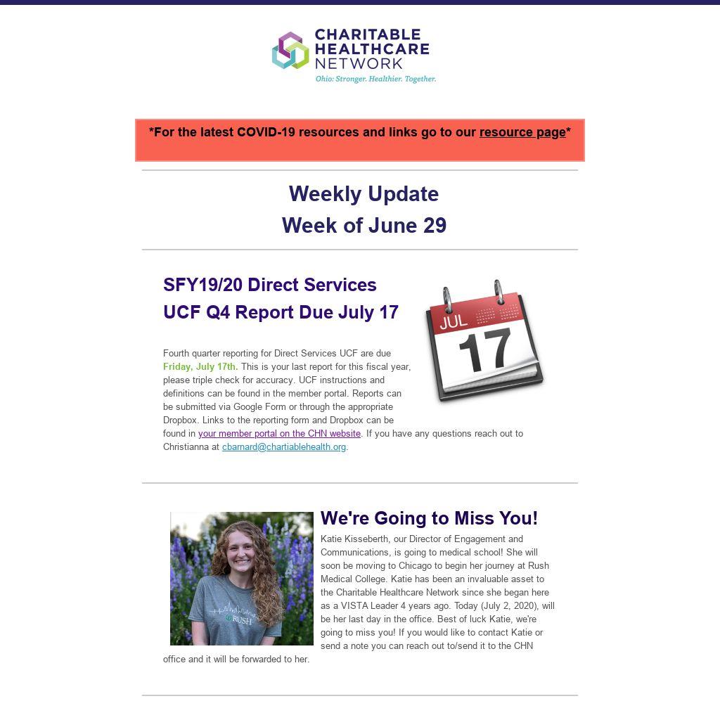 Katie Kisseberth, our Director of Engagement and Communications, is going to medical school! She will soon be moving to Chicago to begin her journey at Rush Medical College. Katie has been an invaluable asset to the Charitable Healthcare Network since she began here as a VISTA Leader 4 years ago. Today (July 2, 2020), will be her last day in the office. Best of luck Katie, we're going to miss you! If you would like to contact Katie or send a note you can reach out to/send it to the CHN office and it will be forwarded to her.