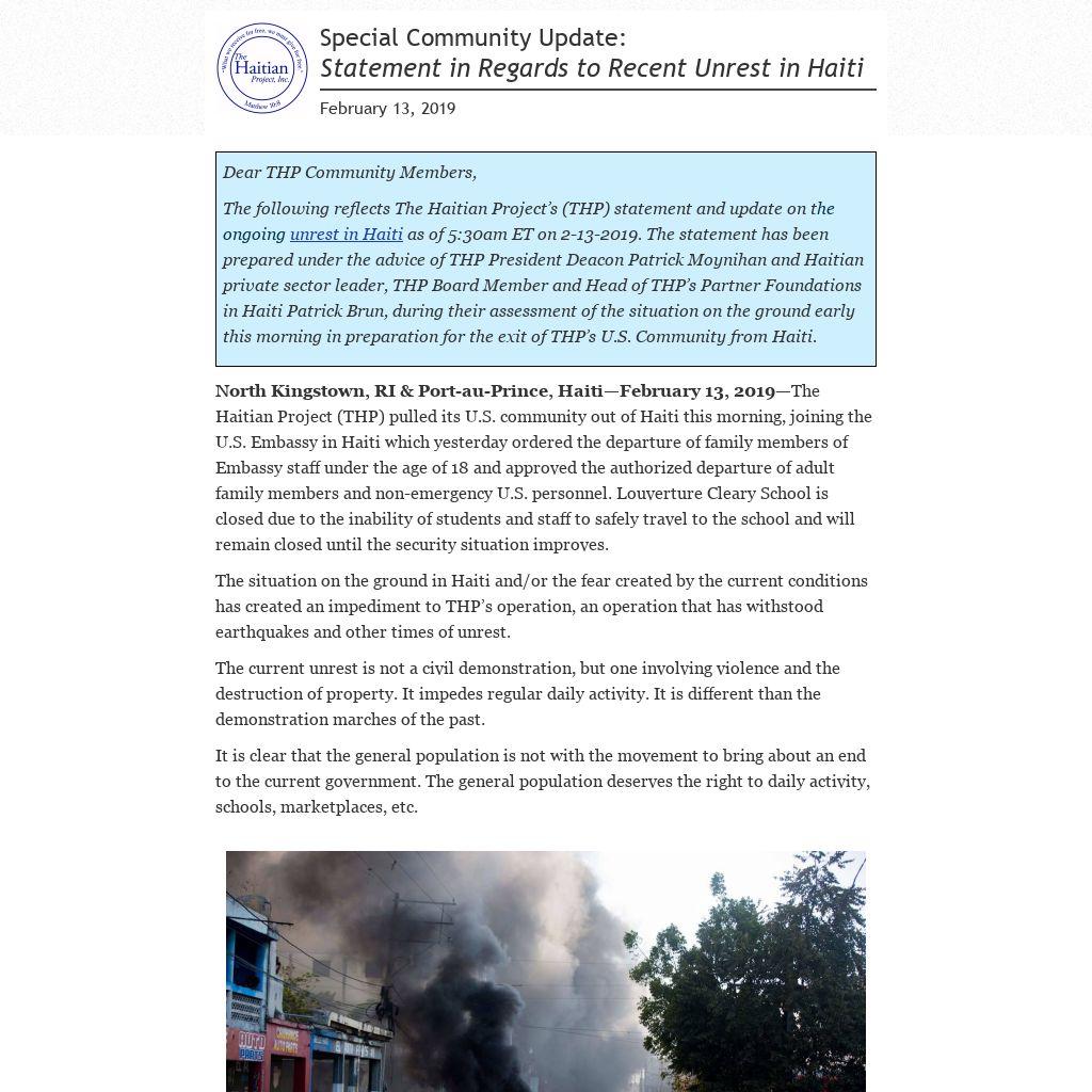 North Kingstown, RI & Port-au-Prince, Haiti—February 13, 2019—The Haitian Project (THP) pulled its U.S. community out of Haiti this morning, joining the U.S. Embassy in Haiti which yesterday ordered the departure of family members of Embassy staff under the age of 18 and approved the authorized departure of adult family members and non-emergency U.S. personnel. Louverture Cleary School is closed due to the inability of students and staff to safely travel to the school and will remain closed until the security situation improves.