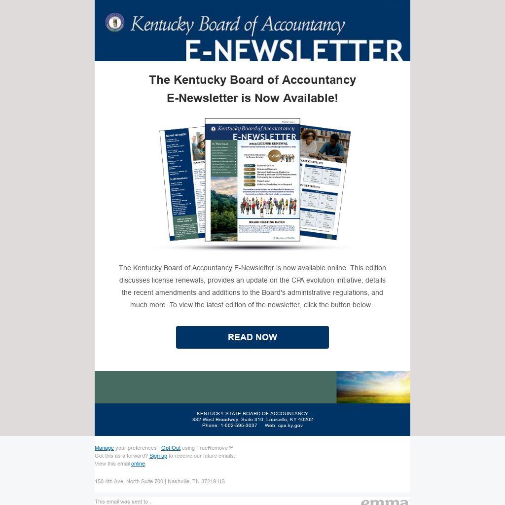 The Kentucky Board of Accountancy E-Newsletter is now available online. This edition discusses license renewals, provides an update on the CPA evolution initiative, details the recent amendments and additions to the Board's administrative regulations, and much more. To view the latest edition of the newsletter, click the button below.