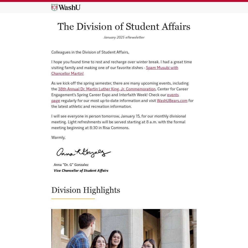 As we kick-off the spring semester, there are many upcoming events, including the 38th Annual Dr. Martin Luther King, Jr. Commemoration, Center for Career Engagement’s Spring Career Expo and Interfaith Week! Check our events page regularly for our most up-to-date information and visit WashUBears.com for the latest athletic and recreation information.