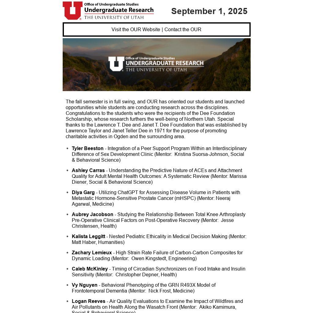 The fall semester is in full swing, and OUR has oriented our students and launched opportunities while students are conducting research across the disciplines. Congratulations to the students who were the recipients of the Dee Foundation Scholarship, whose research furthers the well-being of Northern Utah. Special thanks to the Lawrence T. Dee and Janet T. Dee Foundation that was established by Lawrence Taylor and Janet Teller Dee in 1971 for the purpose of promoting charitable activities in Ogden and the surrounding area.