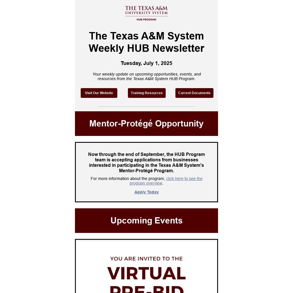 Your weekly update on upcoming opportunities, events, and resources from the Texas A&M System HUB Program.
