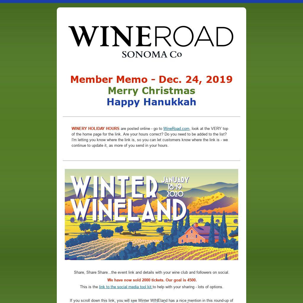 WINERY HOLIDAY HOURS are posted online - go to WineRoad.com, look at the VERY top of the home page for the link. Are your hours correct? Do you need to be added to the list? I'm letting you know where the link is, so you can let customers know where the link is - we continue to update it, as more of you send in your hours.