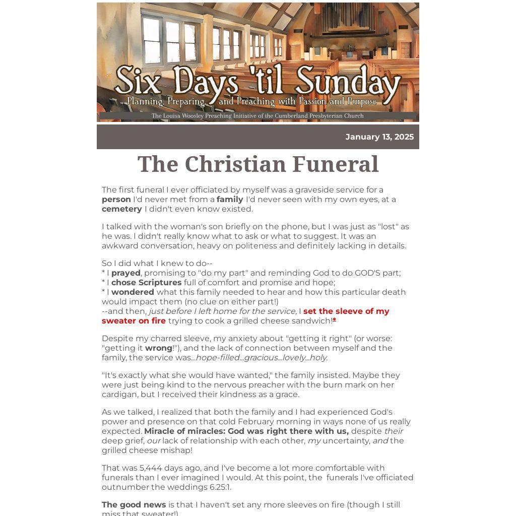 Once we've gotten a handle on our "why," we will move on to ways we can work with the funeral director to help grieving families plan a service that is personal without being so "personalized" we lose sight of the Gospel.
