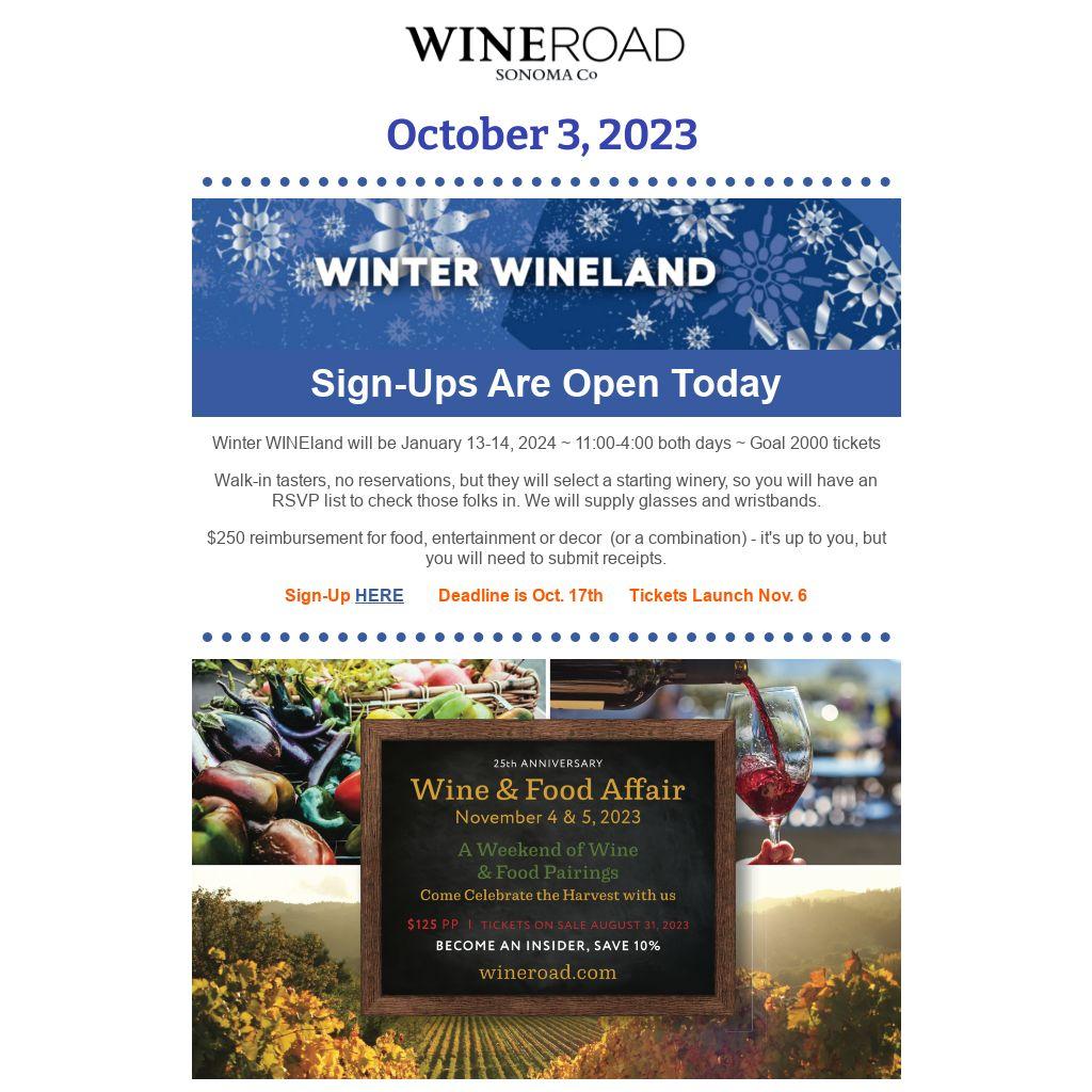 Winter WINEland will be January 13-14, 2024 ~ 11:00-4:00 both days ~ Goal 2000 tickets