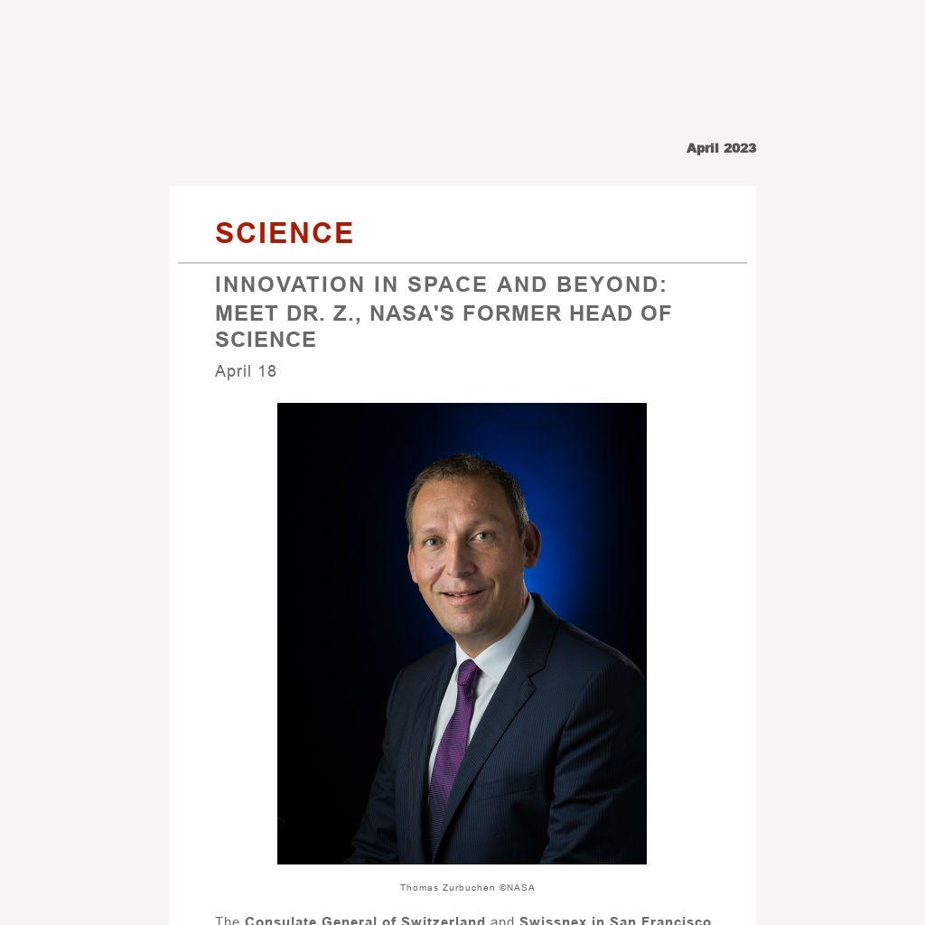 The Consulate General of Switzerland and Swissnex in San Francisco will welcome the world-renowned Swiss-American astrophysicist Dr. Thomas Zurbuchen for a special talk about the role that teamwork plays in innovation and in pushing scientific boundaries in the field of space research.