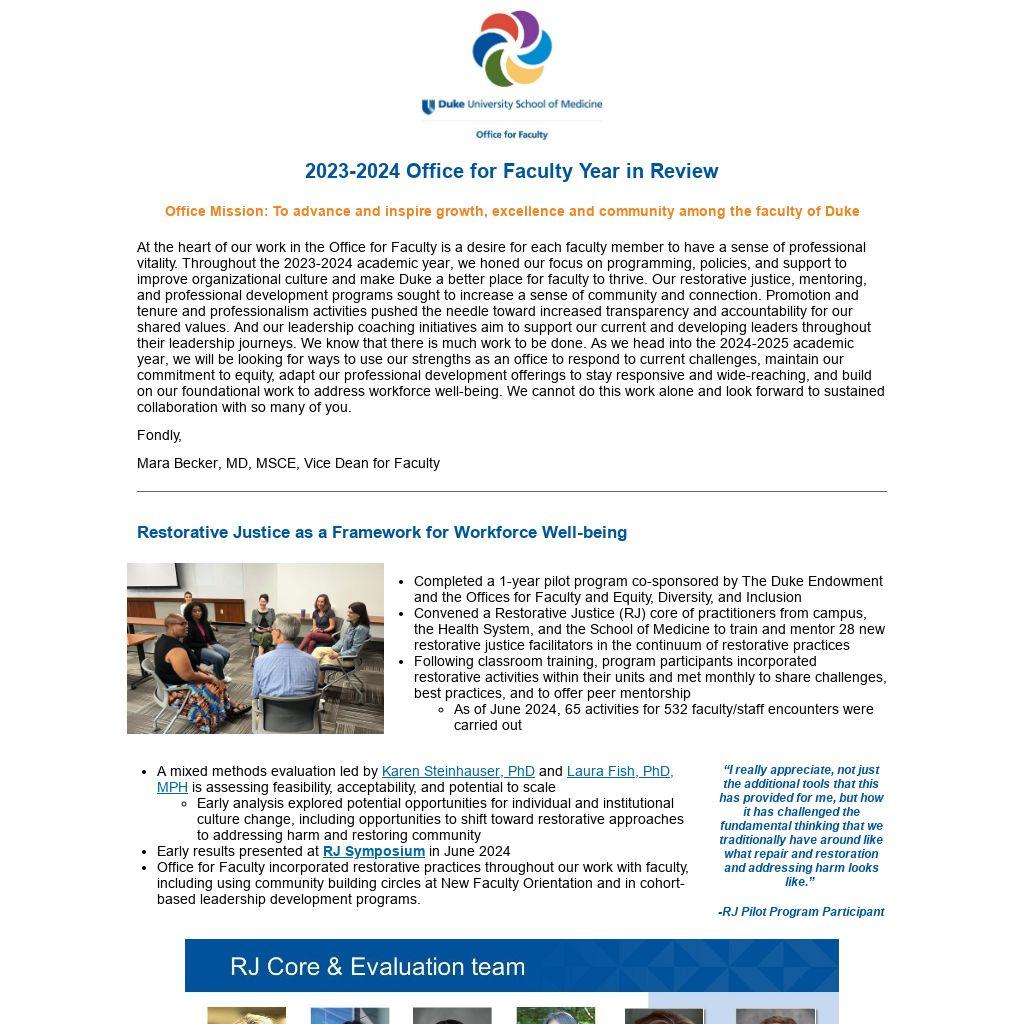 At the heart of our work in the Office for Faculty is a desire for each faculty member to have a sense of professional vitality. Throughout the 2023-2024 academic year, we honed our focus on programming, policies, and support to improve organizational culture and make Duke a better place for faculty to thrive. Our restorative justice, mentoring, and professional development programs sought to increase a sense of community and connection. Promotion and tenure and professionalism activities pushed the needle toward increased transparency and accountability for our shared values. And our leadership coaching initiatives aim to support our current and developing leaders throughout their leadership journeys. We know that there is much work to be done. As we head into the 2024-2025 academic year, we will be looking for ways to use our strengths as an office to respond to current challenges, maintain our commitment to equity, adapt our professional development offerings to stay responsive and wide-reaching, and build on our foundational work to address workforce well-being. We cannot do this work alone and look forward to sustained collaboration with so many of you.