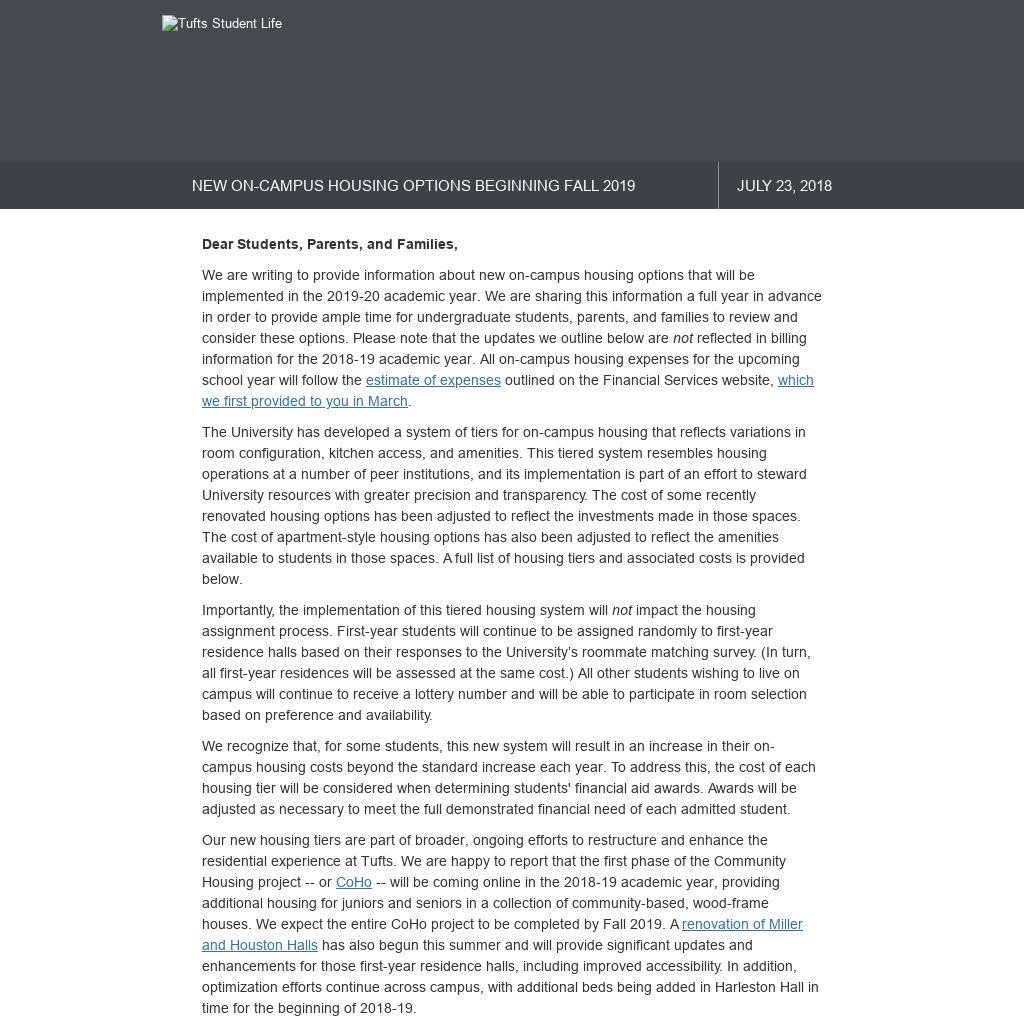 Our new housing tiers are part of broader, ongoing efforts to restructure and enhance the residential experience at Tufts. We are happy to report that the first phase of the Community Housing project -- or CoHo -- will be coming online in the 2018-19 academic year, providing additional housing for juniors and seniors in a collection of community-based, wood-frame houses. We expect the entire CoHo project to be completed by Fall 2019. A renovation of Miller and Houston Halls has also begun this summer and will provide significant updates and enhancements for those first-year residence halls, including improved accessibility. In addition, optimization efforts continue across campus, with additional beds being added in Harleston Hall in time for the beginning of 2018-19. We hope this information is useful as you begin to consider housing options for the 2019-20 academic year. For questions related to the new housing tiers or other aspects of residential life at Tufts, please email reslife@tufts.edu.