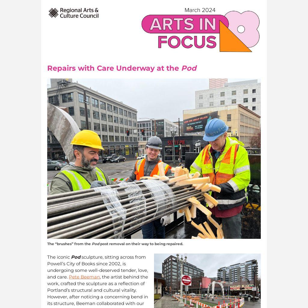 The iconic Pod sculpture, sitting across from Powell’s City of Books since 2002, is undergoing some well-deserved tender, love, and care. Pete Beeman, the artist behind the work, crafted the sculpture as a reflection of Portland’s structural and cultural vitality. However, after noticing a concerning bend in its structure, Beeman collaborated with our Public Art team to conduct maintenance. While the sculpture's main tripod currently remains on site, its “brushes” or counterweight is in repair, and slated to return this summer.
