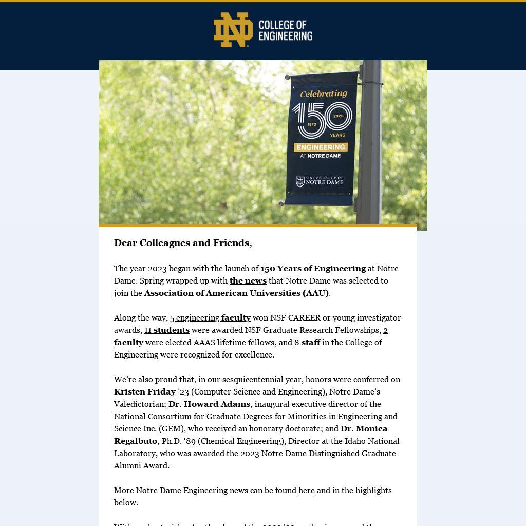 The year 2023 began with the launch of 150 Years of Engineering at Notre Dame. Spring wrapped up with the news that Notre Dame was selected to join the Association of American Universities (AAU).