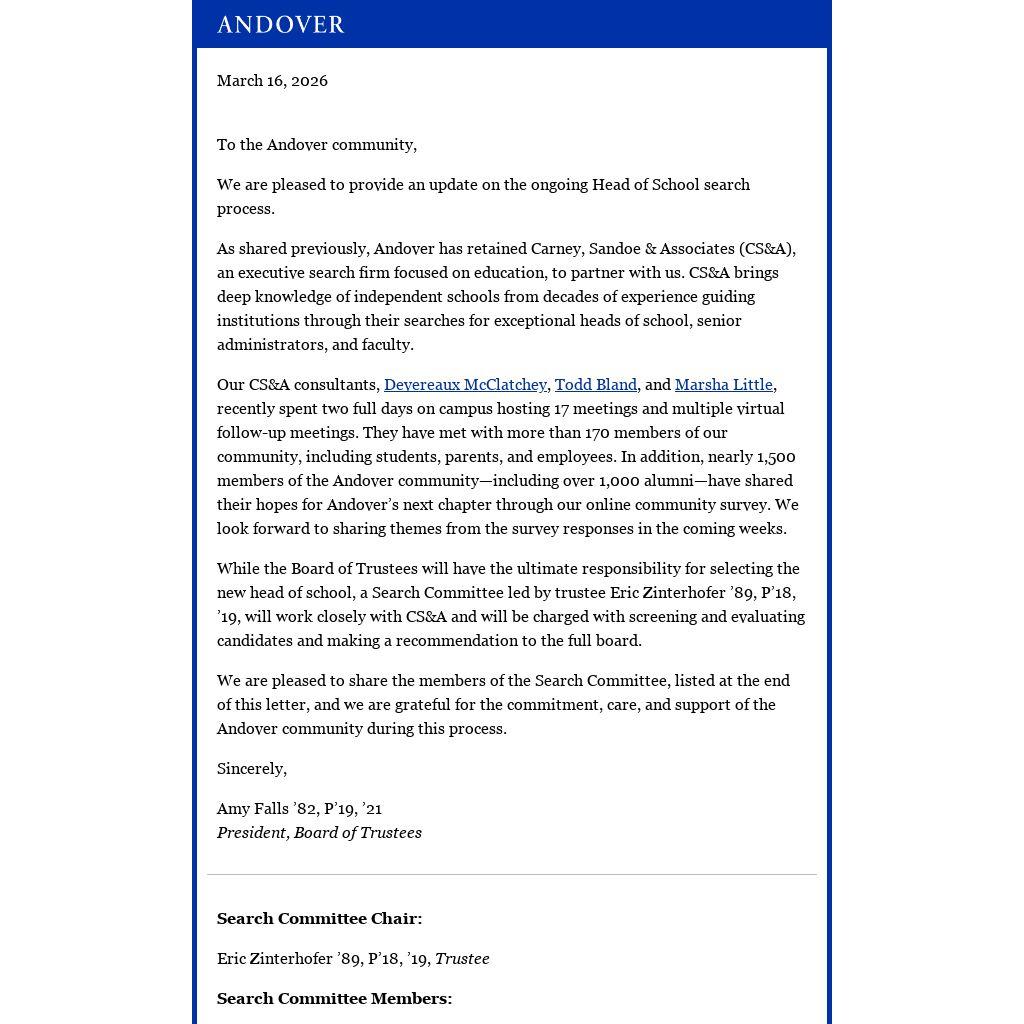 As shared previously, Andover has retained Carney, Sandoe & Associates (CS&A), an executive search firm focused on education, to partner with us. CS&A brings deep knowledge of independent schools from decades of experience guiding institutions through their searches for exceptional heads of school, senior administrators, and faculty.