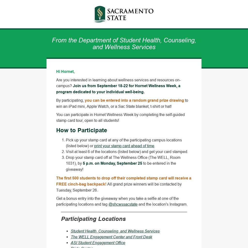 You can participate in Hornet Wellness Week by completing the self-guided stamp card tour, open to all students!