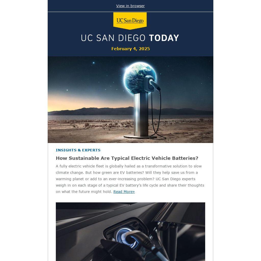 A fully electric vehicle fleet is globally hailed as a transformative solution to slow climate change. But how green are EV batteries? Will they help save us from a warming planet or add to an ever-increasing problem? UC San Diego experts weigh in on each stage of a typical EV battery’s life cycle and share their thoughts on what the future might hold. Read More»