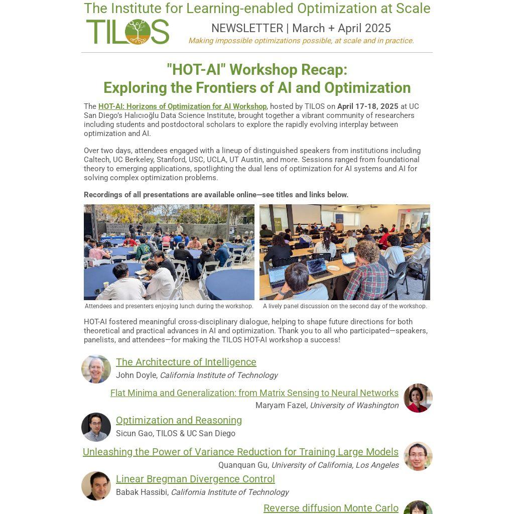 The HOT-AI: Horizons of Optimization for AI Workshop, hosted by TILOS on April 17-18, 2025 at UC San Diego’s Halıcıoğlu Data Science Institute, brought together a vibrant community of researchers including students and postdoctoral scholars to explore the rapidly evolving interplay between optimization and AI.