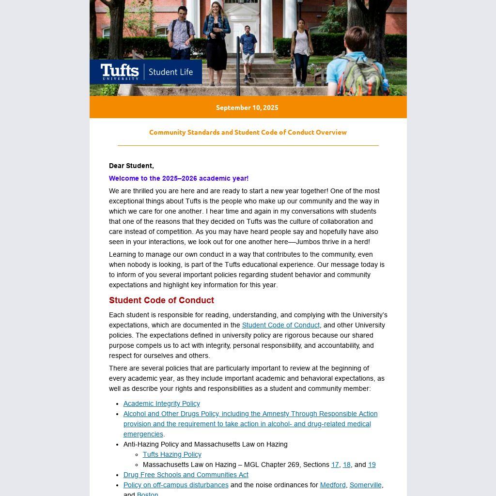 Learning to manage our own conduct in a way that contributes to the community, even when nobody is looking, is part of the Tufts educational experience. Our message today is to inform of you several important policies regarding student behavior and community expectations and highlight key information for this year.