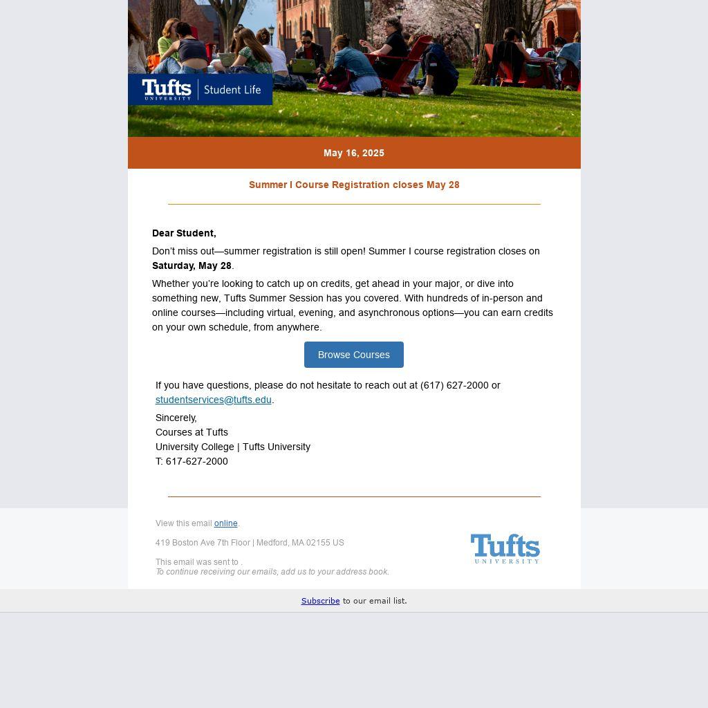 Whether you’re looking to catch up on credits, get ahead in your major, or dive into something new, Tufts Summer Session has you covered. With hundreds of in-person and online courses—including virtual, evening, and asynchronous options—you can earn credits on your own schedule, from anywhere.