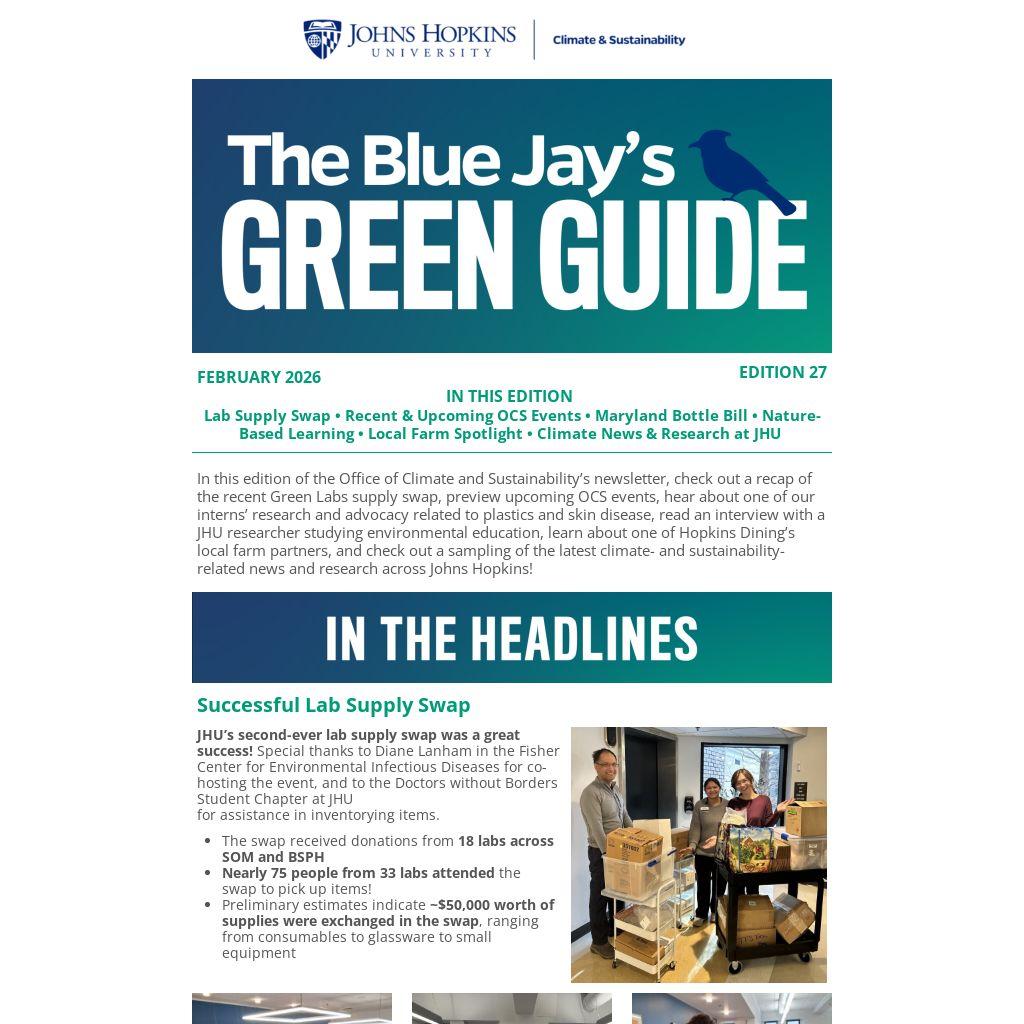 In this edition of the Office of Climate and Sustainability’s newsletter, check out a recap of the recent Green Labs supply swap, preview upcoming OCS events, hear about one of our interns’ research and advocacy related to plastics and skin disease, read an interview with a JHU researcher studying environmental education, learn about one of Hopkins Dining’s local farm partners, and check out a sampling of the latest climate- and sustainability-related news and research across Johns Hopkins!