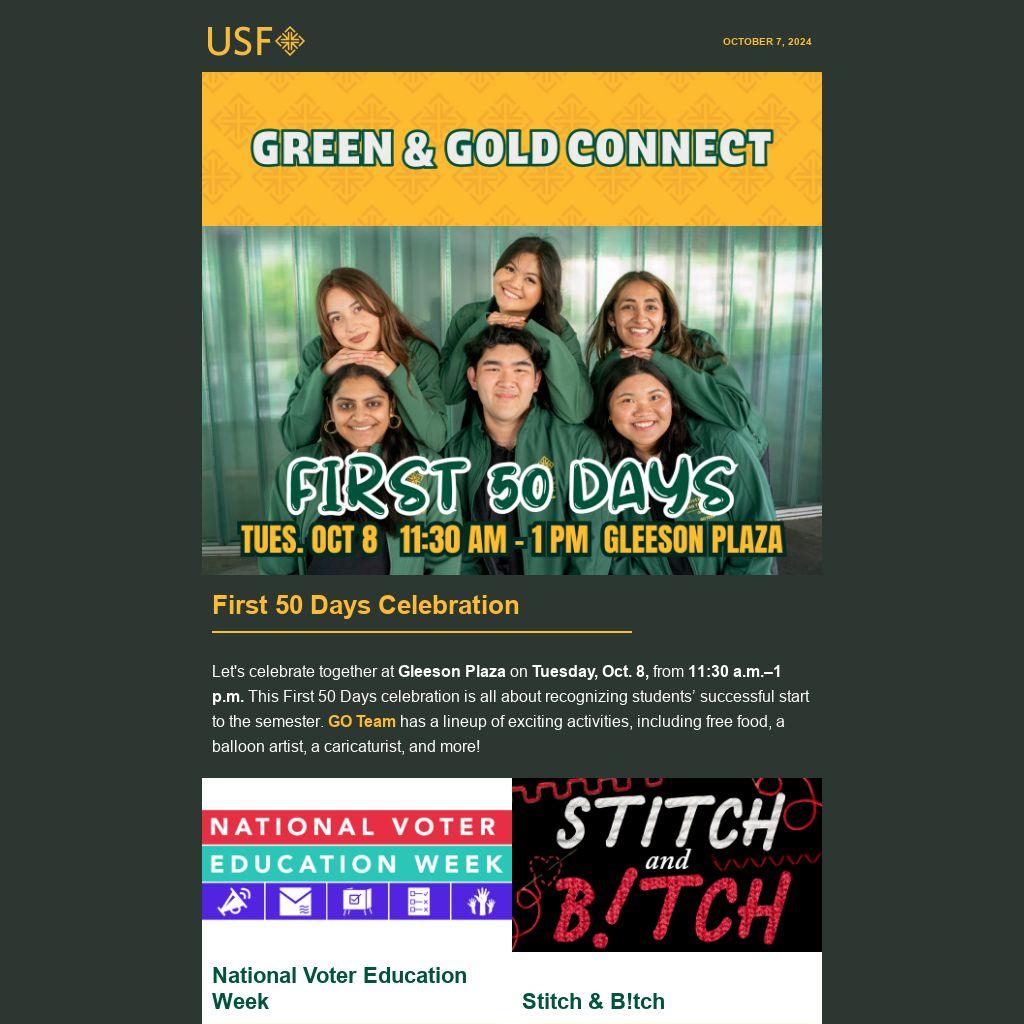 Let's celebrate together at Gleeson Plaza on Tuesday, Oct. 8, from 11:30 a.m.–1 p.m. This First 50 Days celebration is all about recognizing students’ successful start to the semester. GO Team has a lineup of exciting activities, including free food, a balloon artist, a caricaturist, and more!