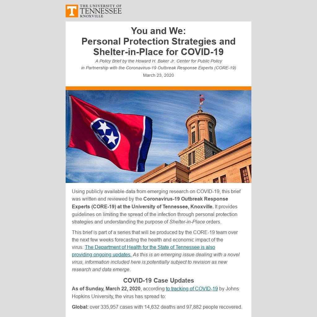 You and We: Personal Protection Strategies and Shelter-in-Place for COVID-19A Policy Brief by the Howard H. Baker Jr. Center for Public Policy in Partnership with the Coronavirus-19 Outbreak Response Experts (CORE-19)March 23, 2020