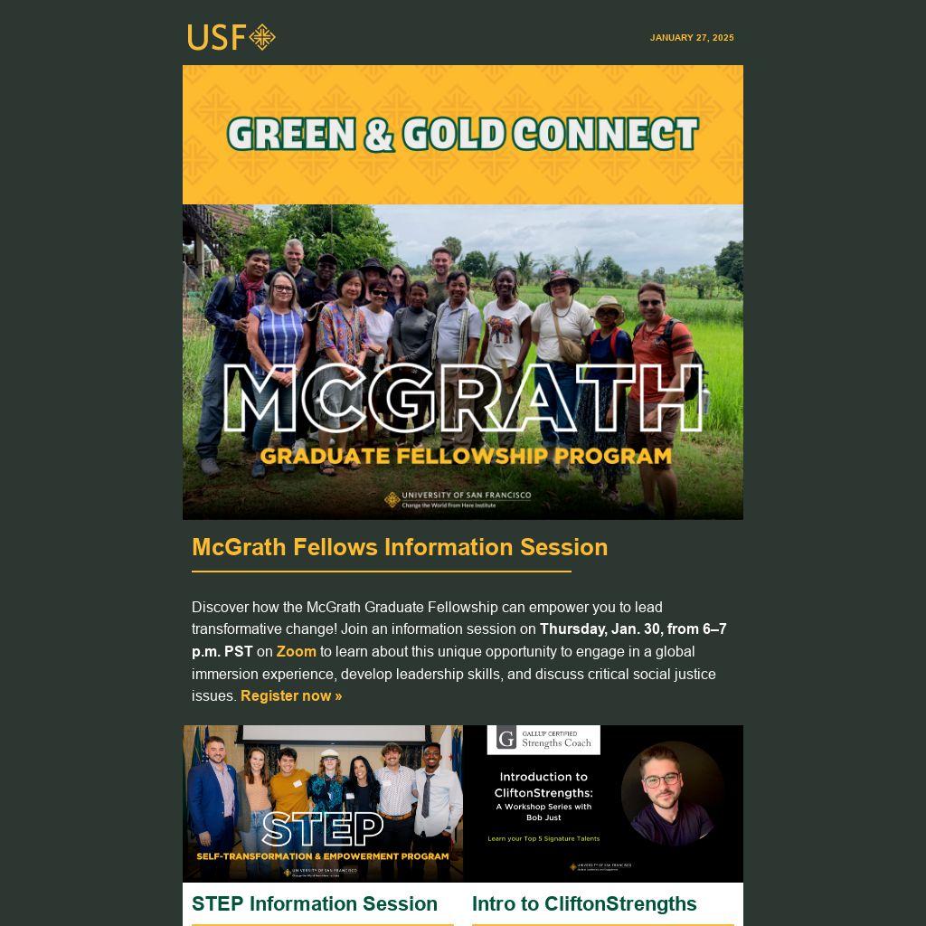 Discover how the McGrath Graduate Fellowship can empower you to lead transformative change! Join an information session on Thursday, Jan. 30, from 6–7 p.m. PST on Zoom to learn about this unique opportunity to engage in a global immersion experience, develop leadership skills, and discuss critical social justice issues. Register now »
