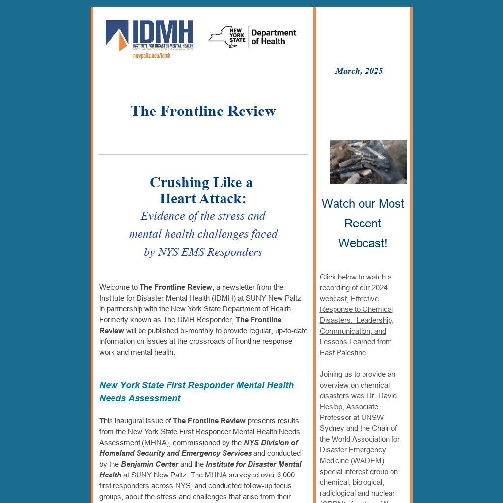 Welcome to The Frontline Review, a newsletter from the Institute for Disaster Mental Health (IDMH) at SUNY New Paltz in partnership with the New York State Department of Health. Formerly known as The DMH Responder, The Frontline Review will be published bi-monthly to provide regular, up-to-date information on issues at the crossroads of frontline response work and mental health.