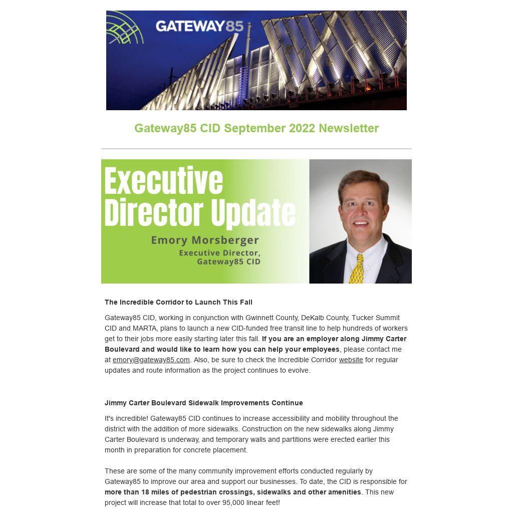 Gateway85 CID, working in conjunction with Gwinnett County, DeKalb County, Tucker Summit CID and MARTA, plans to launch a new CID-funded free transit line to help hundreds of workers get to their jobs more easily starting later this fall. If you are an employer along Jimmy Carter Boulevard and would like to learn how you can help your employees, please contact me at emory@gateway85.com. Also, be sure to check the Incredible Corridor website for regular updates and route information as the project continues to evolve.
