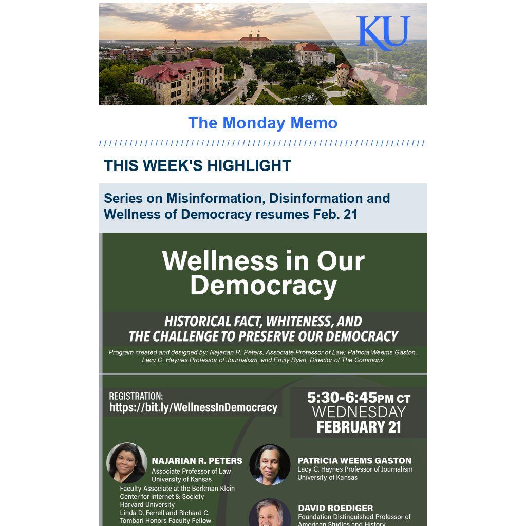 - Feb. 21: Wellness in Democracy series, 5:30-6:45 p.m., Zoom