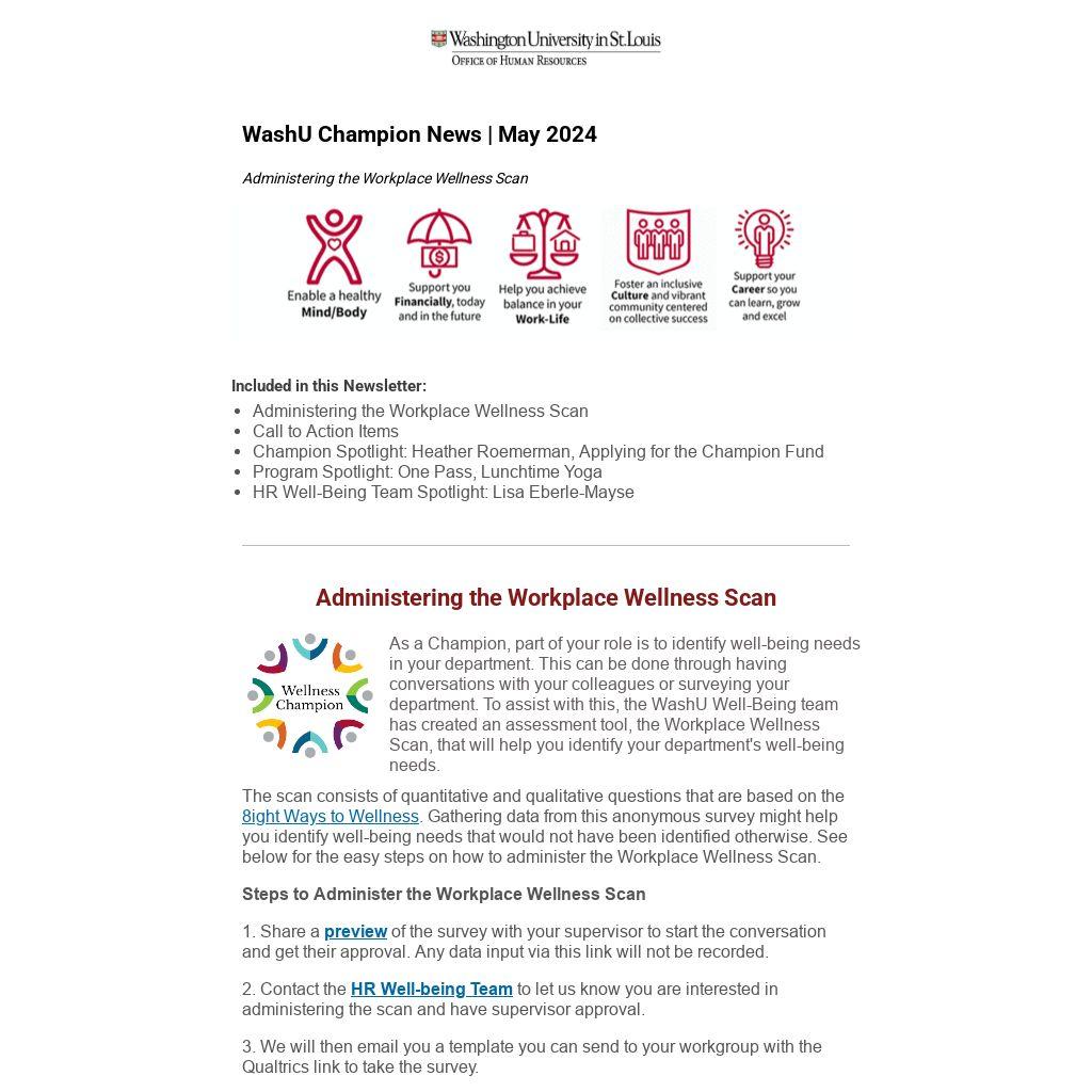 As a Champion, part of your role is to identify well-being needs in your department. This can be done through having conversations with your colleagues or surveying your department. To assist with this, the WashU Well-Being team has created an assessment tool, the Workplace Wellness Scan, that will help you identify your department's well-being needs.