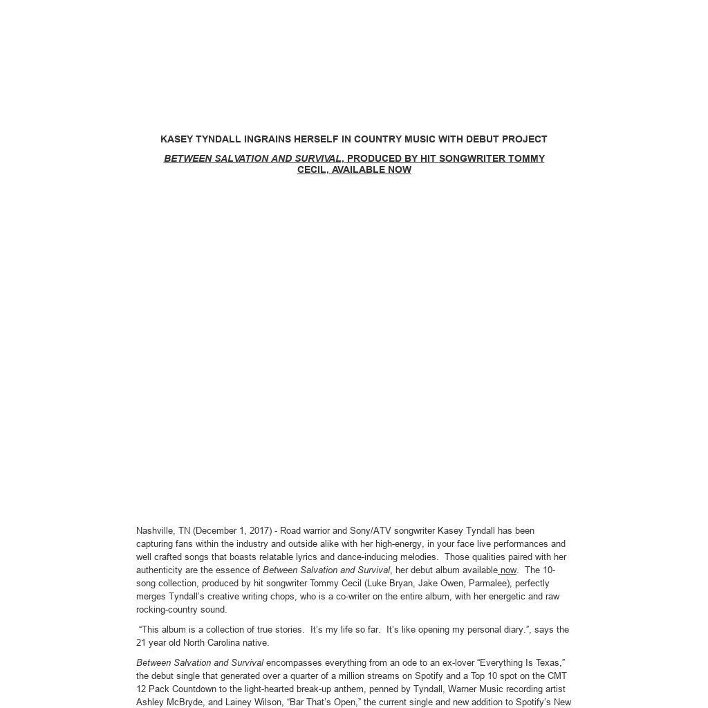Between Salvation and Survival encompasses everything from an ode to an ex-lover “Everything Is Texas,” the debut single that generated over a quarter of a million streams on Spotify and a Top 10 spot on the CMT 12 Pack Countdown to the light-hearted break-up anthem, penned by Tyndall, Warner Music recording artist Ashley McBryde, and Lainey Wilson, “Bar That’s Open,” the current single and new addition to Spotify’s New Boots playlist. Other cuts include “Friday Night,” the feel good sing-along written by Tyndall, Matt Thomas of Parmalee and Reid Isbell, the rocking confident female jam “Everyday Girl,” written by Tyndall, Taylor Phillips (writer of Luke Comb’s #1 Hurricane), Matt Roy and Ricky Young and the deeply personal piano ballad “Bottle and The Bible.”