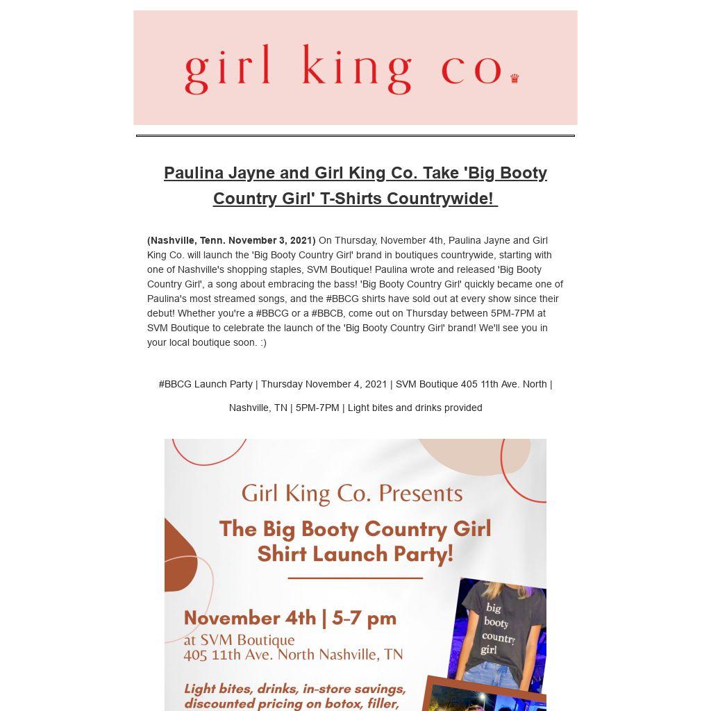 (Nashville, Tenn. November 3, 2021) On Thursday, November 4th, Paulina Jayne and Girl King Co. will launch the 'Big Booty Country Girl' brand in boutiques countrywide, starting with one of Nashville's shopping staples, SVM Boutique! Paulina wrote and released 'Big Booty Country Girl', a song about embracing the bass! 'Big Booty Country Girl' quickly became one of Paulina's most streamed songs, and the #BBCG shirts have sold out at every show since their debut! Whether you're a #BBCG or a #BBCB, come out on Thursday between 5PM-7PM at SVM Boutique to celebrate the launch of the 'Big Booty Country Girl' brand! We'll see you in your local boutique soon. :)