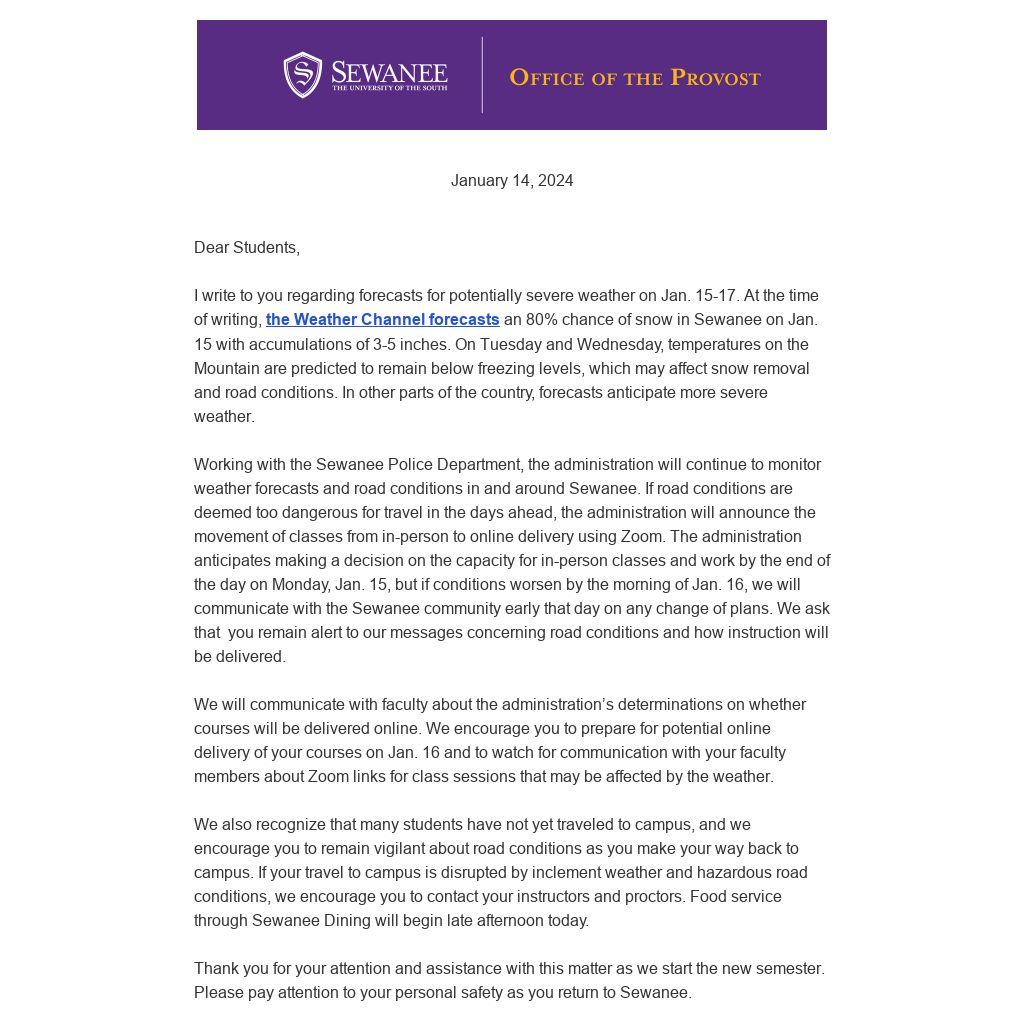 I write to you regarding forecasts for potentially severe weather on Jan. 15-17. At the time of writing, the Weather Channel forecasts an 80% chance of snow in Sewanee on Jan. 15 with accumulations of 3-5 inches. On Tuesday and Wednesday, temperatures on the Mountain are predicted to remain below freezing levels, which may affect snow removal and road conditions. In other parts of the country, forecasts anticipate more severe weather.