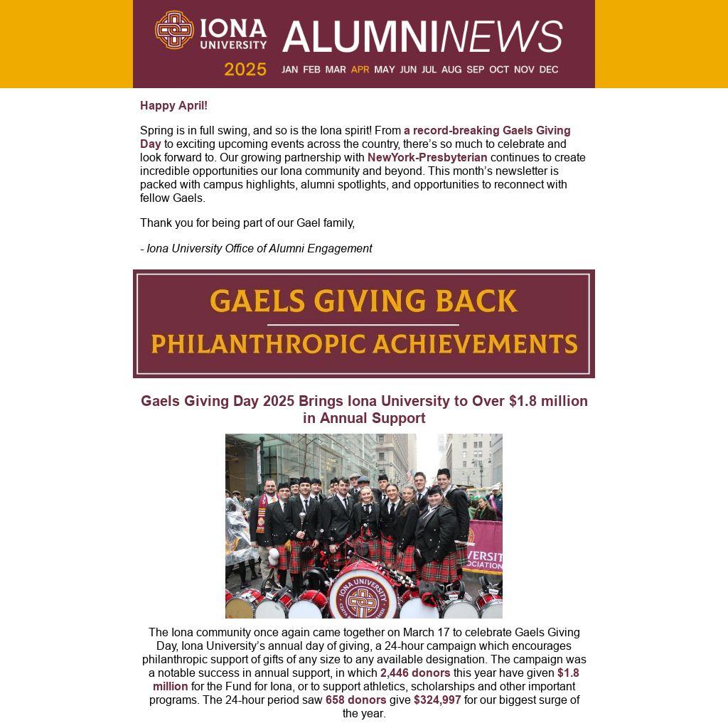 Spring is in full swing, and so is the Iona spirit! From a record-breaking Gaels Giving Day to exciting upcoming events across the country, there’s so much to celebrate and look forward to. Our growing partnership with NewYork-Presbyterian continues to create incredible opportunities our Iona community and beyond. This month’s newsletter is packed with campus highlights, alumni spotlights, and opportunities to reconnect with fellow Gaels.