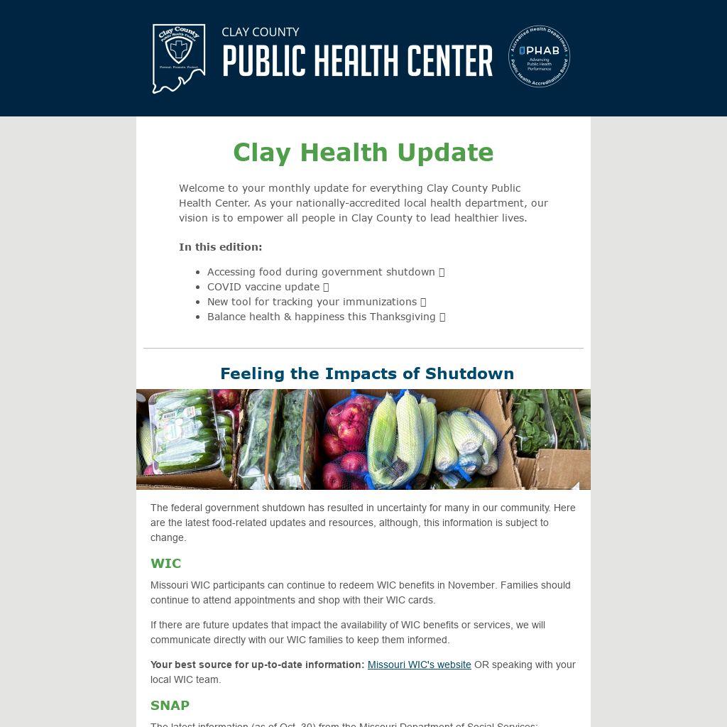 Welcome to your monthly update for everything Clay County Public Health Center. As your nationally-accredited local health department, our vision is to empower all people in Clay County to lead healthier lives.