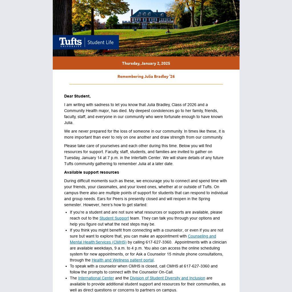 Please take care of yourselves and each other during this time. Below you will find resources for support. Faculty, staff, students, and families are invited to gather on Tuesday, January 14 at 7 p.m. in the Interfaith Center. We will share details of any future Tufts community gathering to remember Julia at a later date.